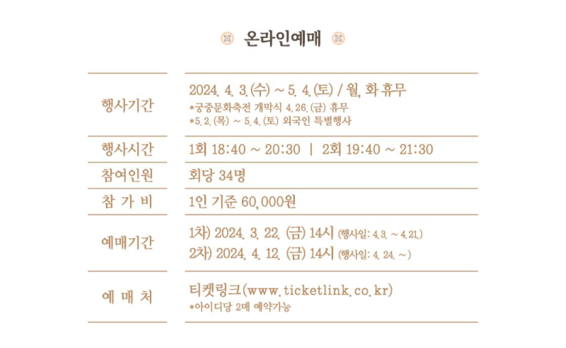 행사기간 : 2024. 4. 3.(수)~ 5. 4.(일) 매주 수~일요일(월, 화 휴무/ 4.26. 궁중문화축전 개막식 휴무)