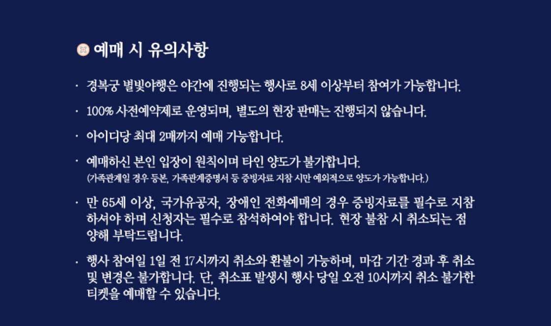 <경복궁 별빛야행>은 행사 전일 17시까지 취소가 가능하며 기간 내 취소 수수료가 부과되지 안습니다.