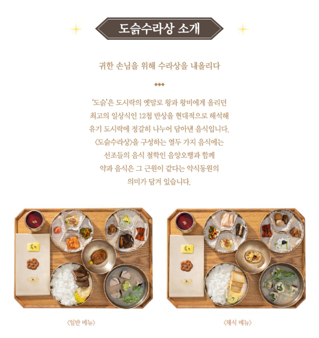 도슭은 도시락의 옛말인데요. 왕과 왕비에게 올리던 최고의 일상식인 12첩 반상을 현대적으로 해석해 정갈히 담아낸 음식이라고 해요.